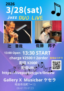 22:14 2026.03.20  ORGAN KENHAMO +PIANO FES VOL.10 前売り 4000円 当日4500円 配信はこちら https://livepocket.jp/e/v8gh1 Music BAR ケセラ 13:30〜14:15 「片山きみこ+片山 恵依子」 片山きみこ(Org.)片山 恵依子(Vo.) 14:30〜15:15 「宮詠子+神田芳郎 」宮詠子(Vo.P)神田芳郎(B.) 15:30〜16:15 「小野みどりDUO」小野みどり(Org)Carl 征太郎Maguire(D.) 16:30〜17:15 「栢本雅子+佐藤大地+西野滉平」 栢本雅子(Org.)佐藤大地(Sax)西野滉平(D.) 17:30〜18:15 「西川直人 Quartetto」 藤井泰弘(Sax.)西川直人(Org)津田藤宏(B.)坂井ちょく(D.) 18:30〜19:15 「北床宗太郎TRIO」. 北床宗太郎(Vln.)西川直人(Org)坂井ちょく(D.)
